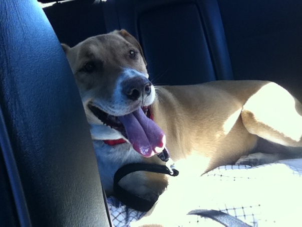 Then we attempted the car. Dunt dunt dooooo. I had put my comfiest blanket in the back seat, a stuffed animal, AND strawberries as a treat to try and entice her. She went right to the backseat, ready to go, plopped in one paw….and then looked helplessly at me. Really, Sunny? You’re a lab! Jump! Oh well. I picked her up (thanks Alix, for the technique hints!) and put her inside. She ate one strawberry, then smashed the rest in the blanket lol. And we were off!!….