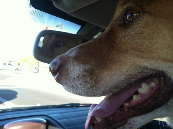 Then we drove 2 miles to South Mountain Park. This time she stayed in the back! We did a pretty steep trail that was probably about a mile to the top. On the way from the lot to the trailhead, Sunny saw the first dog she wanted to play with, a chocolate lab. The moment he saw her, he sprang for her growling & yelping & thank goodness he was on a leash. Sunny just wagged her tail & kept walking, then looked at me like “What was his problem!?”