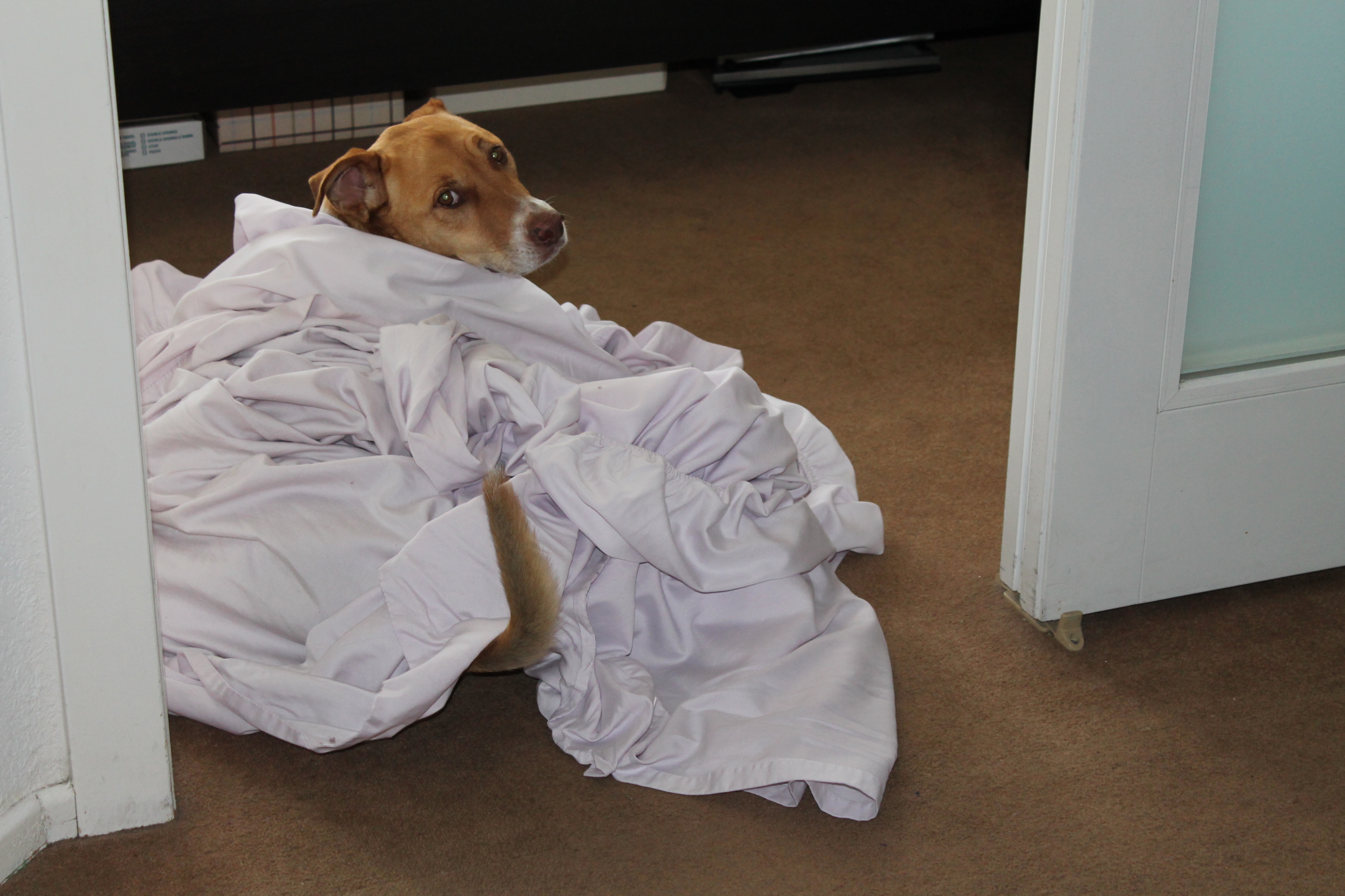 After I got over how adorable she was and snapped the pics, I wrapped her tigher in the blankets, like a burrito, and kept acting like I was going to eat her. I would come at her like you do with little babies that you’re going to tickle, and she was going nuts! She couldn’t stop smiling or wagging her tail or trying to inch away from me, all while wrapped like a little burrito! When I finally went to unwrap her, we played peek-a-poo for a few minutes too. She is too cute!