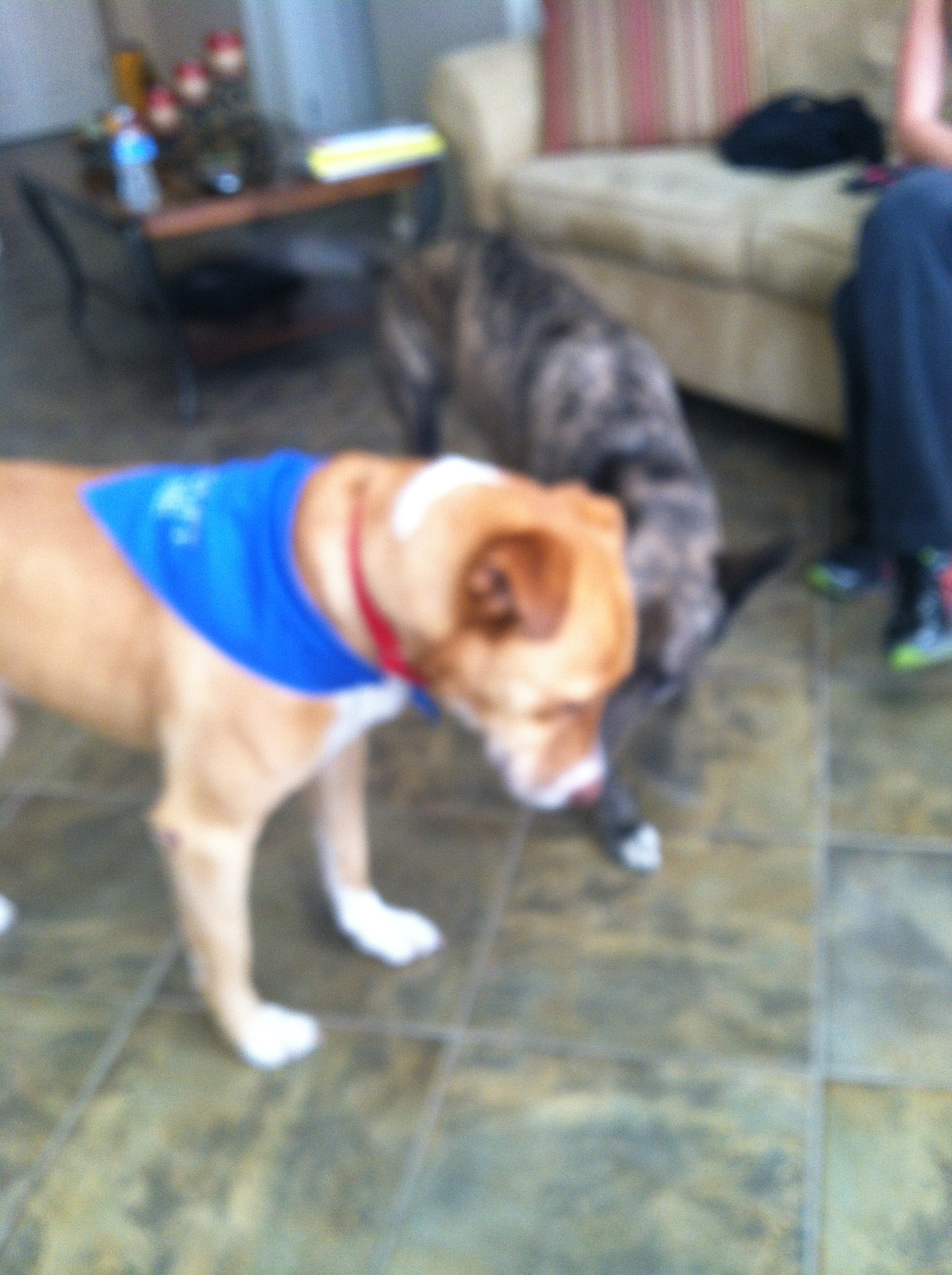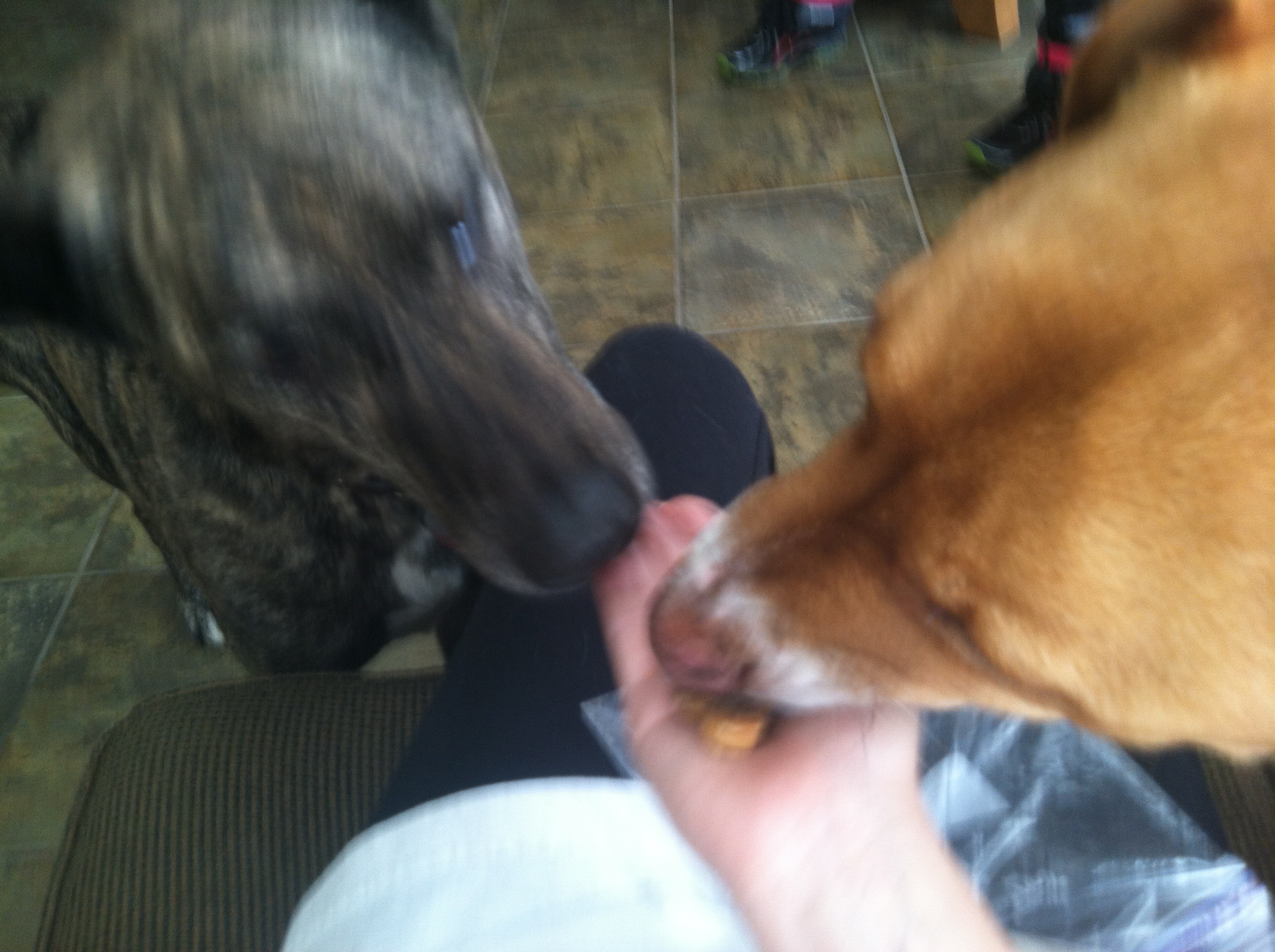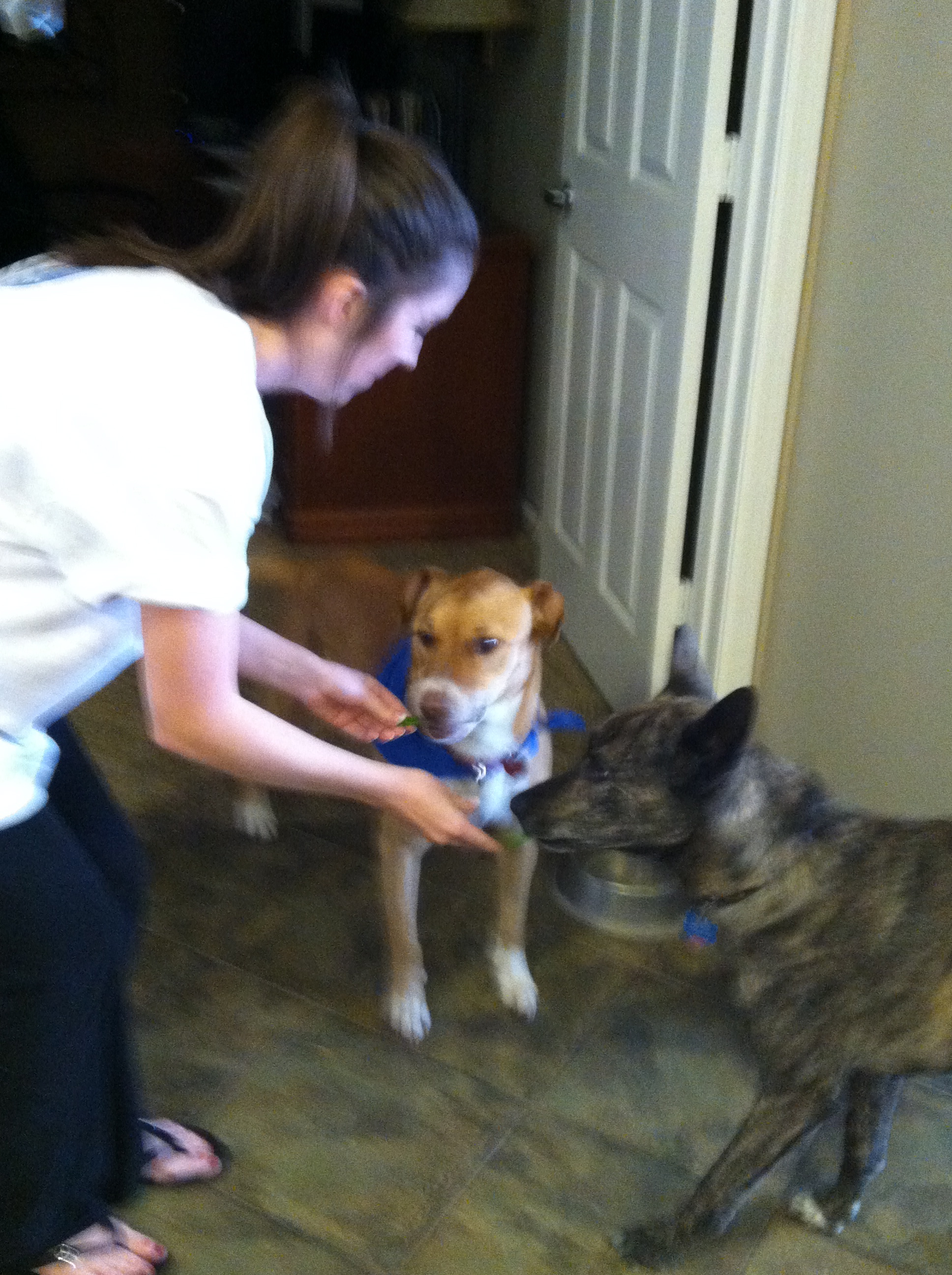2) Sunny’s first playdate! Sunny finally met her wannabe cousin, Guinness! After Guinness scared the living daylights out of her by attacking her with kisses, they shared a peanut butter treat snack, wrestled a bit on the ground, played with their toys, and had some licorice.