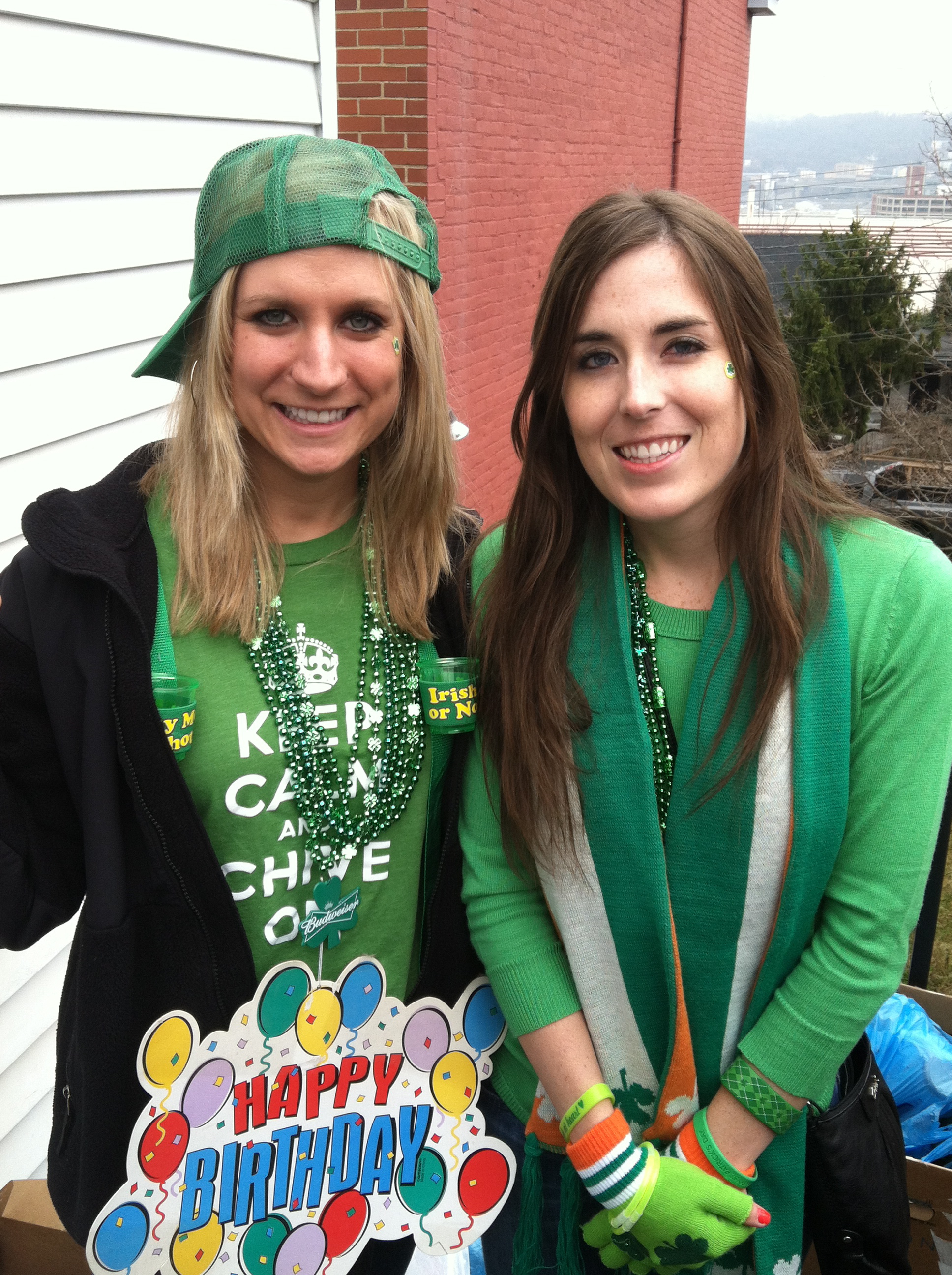 The next morning, Aly’s actual birthday, was when Pittsburgh celebrates St. Patrick’s Day. (They always celebrate it on Saturdays. Weird.) We woke up early, got ready, and headed to Southside, which is sort of like a glorified version of Mill. It’s just a billion bars on one long street, with Primanti’s tucked in the middle. We stopped at JR’s friend’s house party on the way, too.
