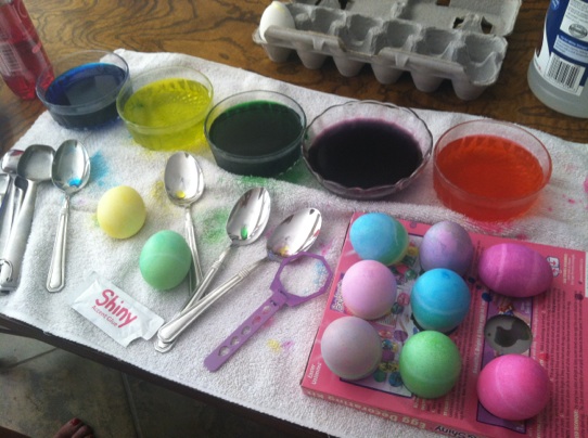 Before dying some eggs! My mom was a professional egg-dyer-and-foiler, but I absolutely sucked. (Which means I hid them toward the back in this picture.)