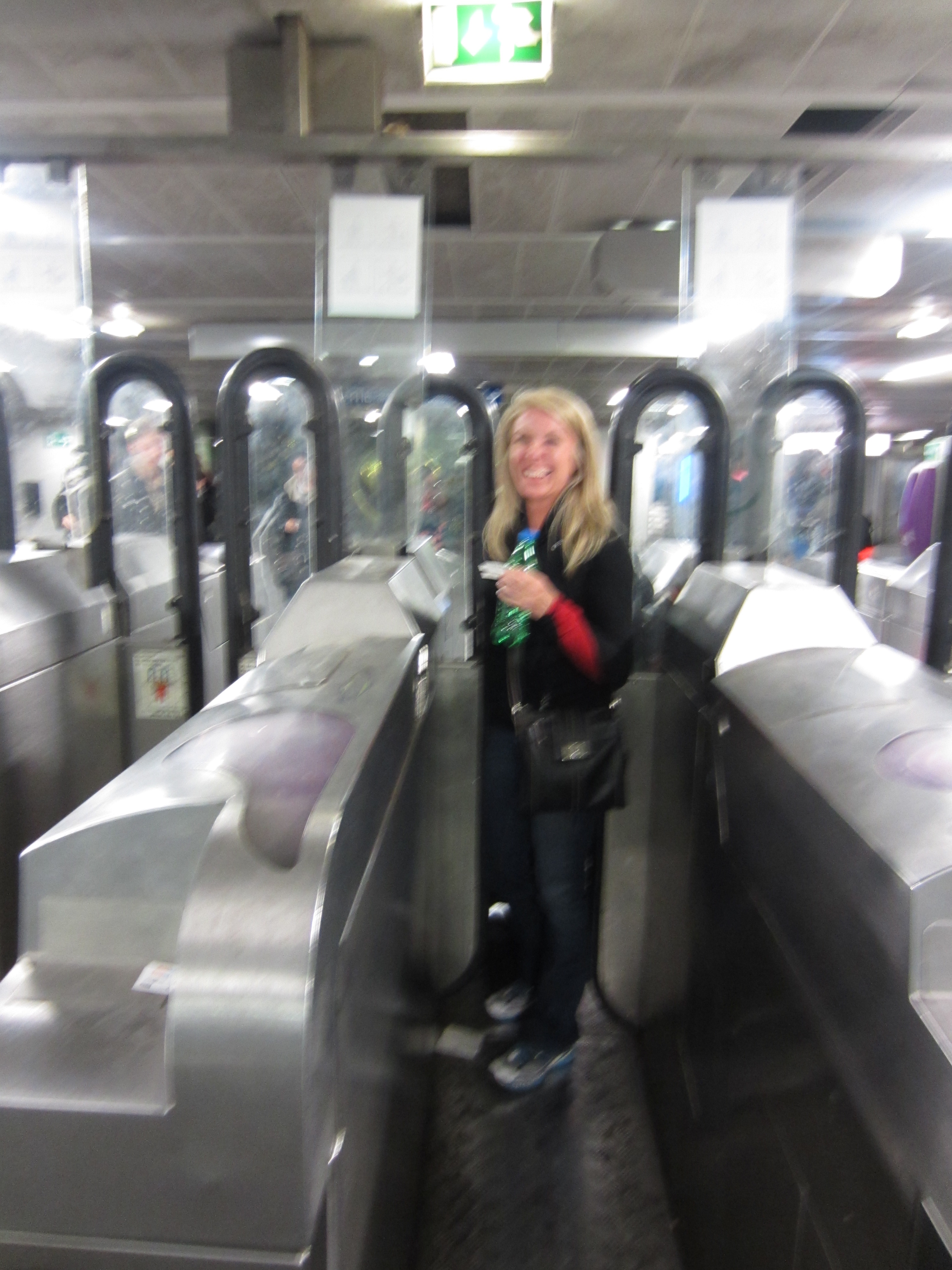 On our way to the train station, from the airport with our luggage, I got through the ticket machine…but my suitcase didn’t. Those two slide glass doors went “SWOOSH” shut on my poor little suitcase, squeezing the living day lights out of it! My stalwart suitcase– we’re going on 13 years together– was being crushed by the vicious metro ticket machine doors. I yanked and yanked and kicked and kicked and couldn’t get my suitcase out of the doors!