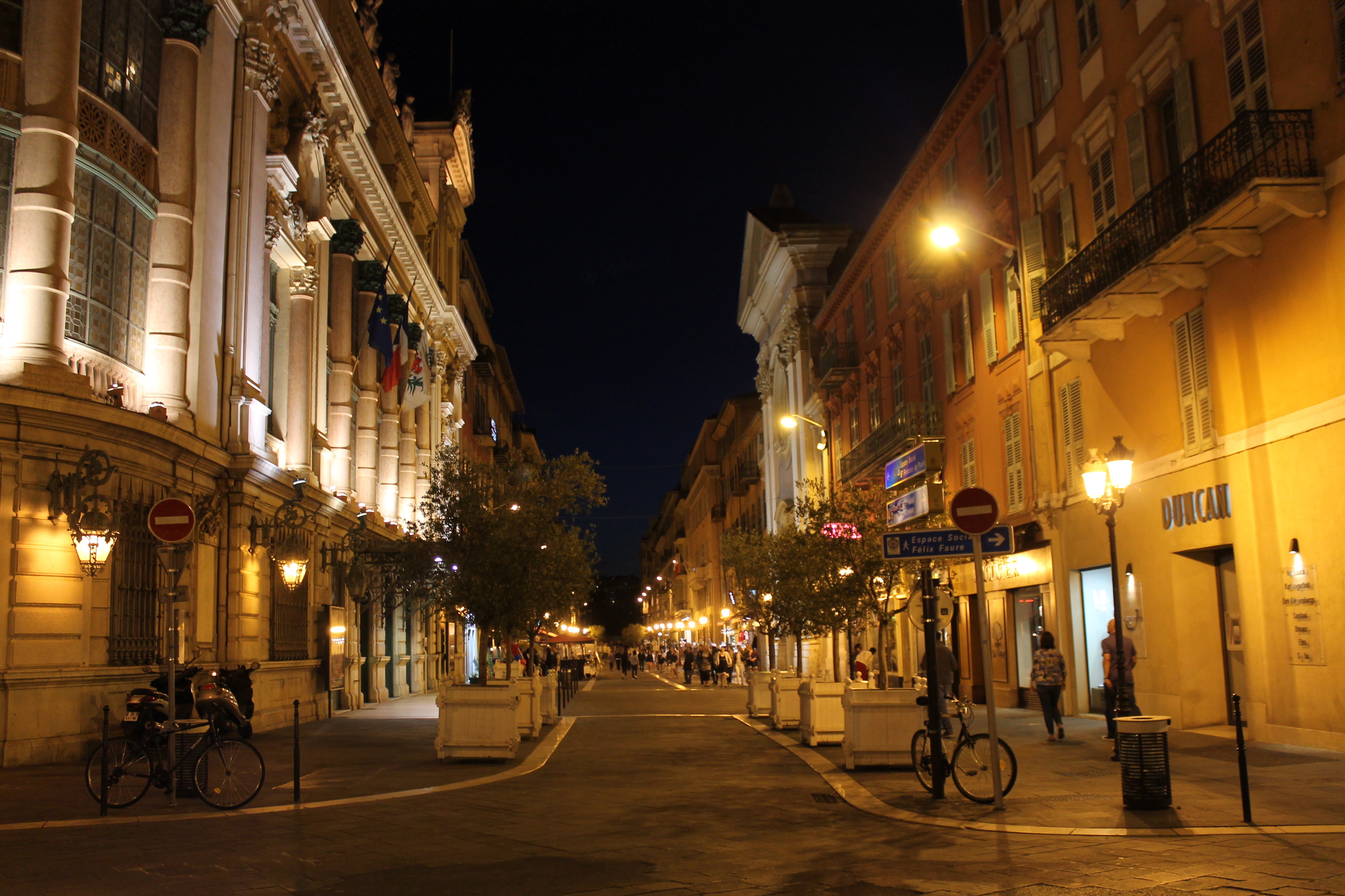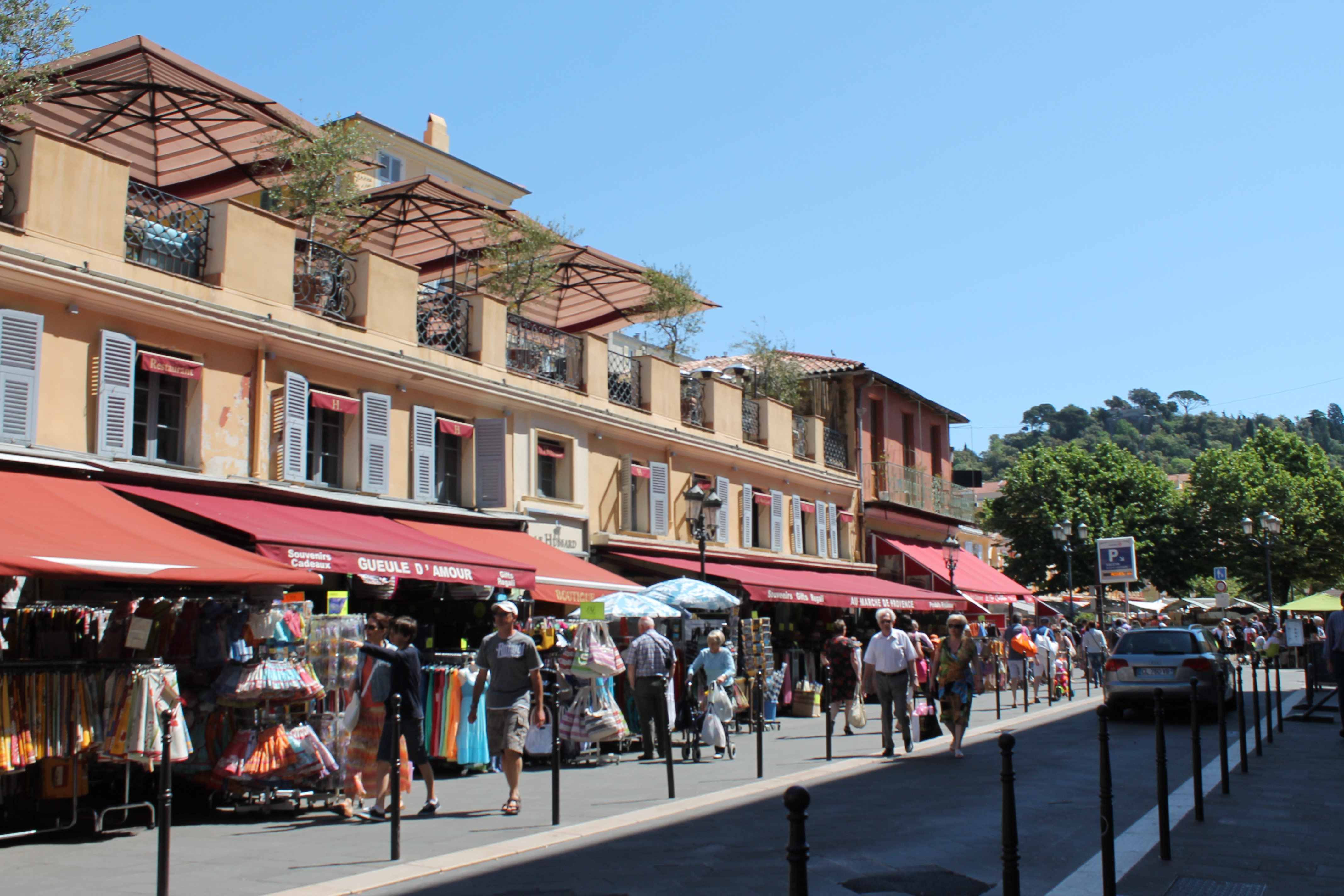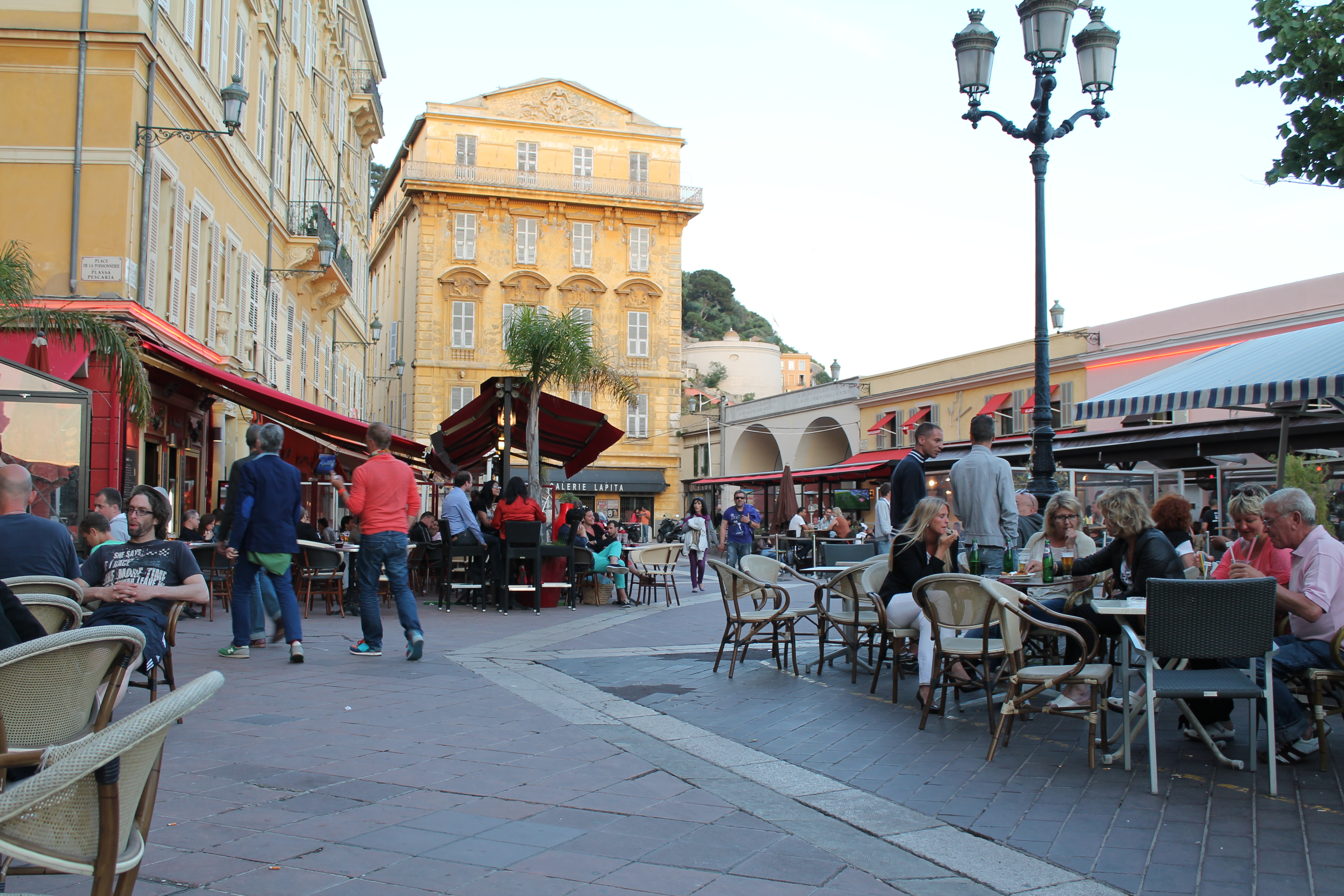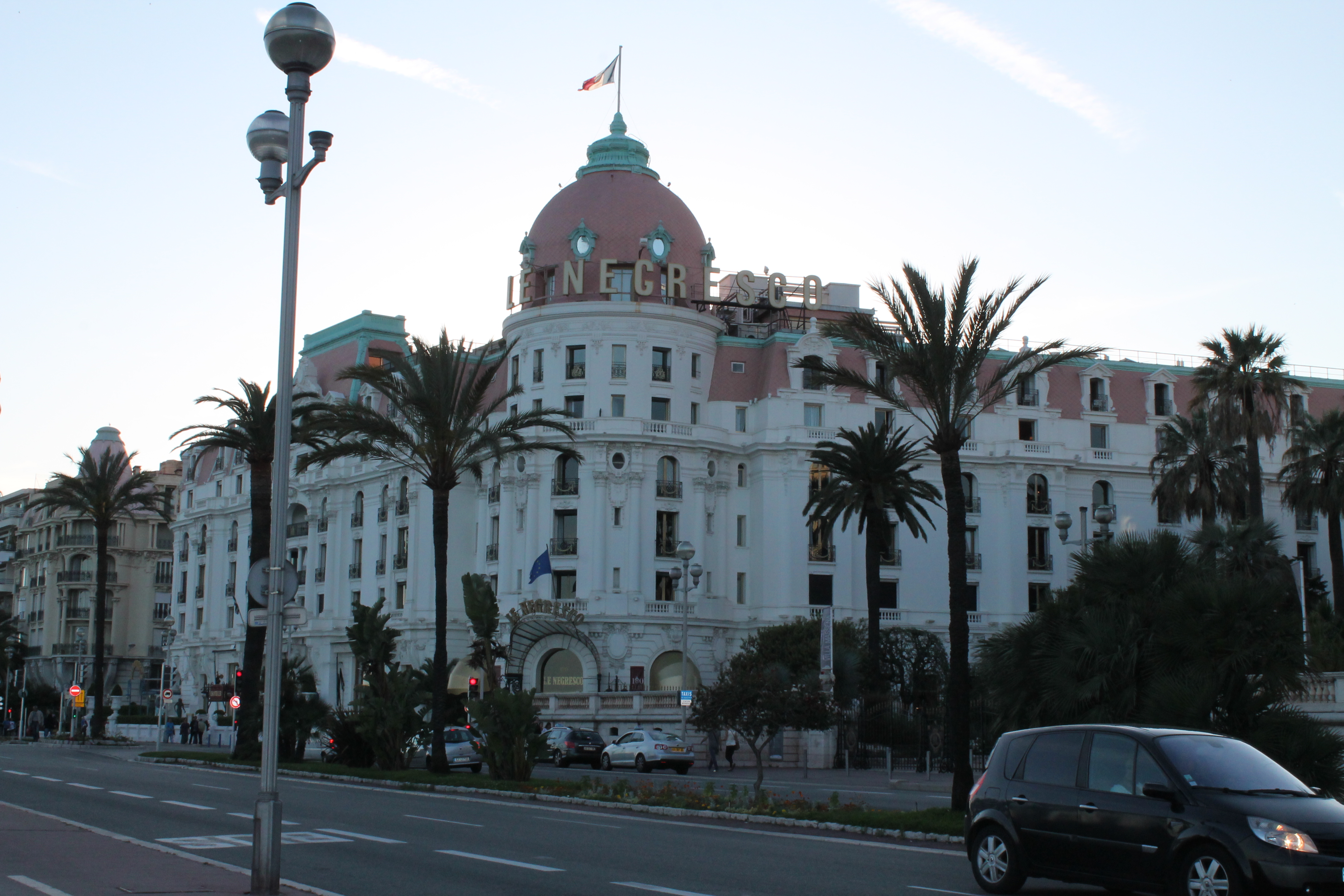 We returned back to Nice, that night at about 6PM. We did some shopping & sightseeing on the way back to our hotel, where we stopped quickly to grab our jackets, since the ocean breeze was picking up. Then we walked along the promenade toward Hotel Negresco– a Nice landmark– before we headed back to the Cours Salaya area. We had noticed during the day that there were tons of delicious smelling cafes along the street, and we were hoping to try out one.