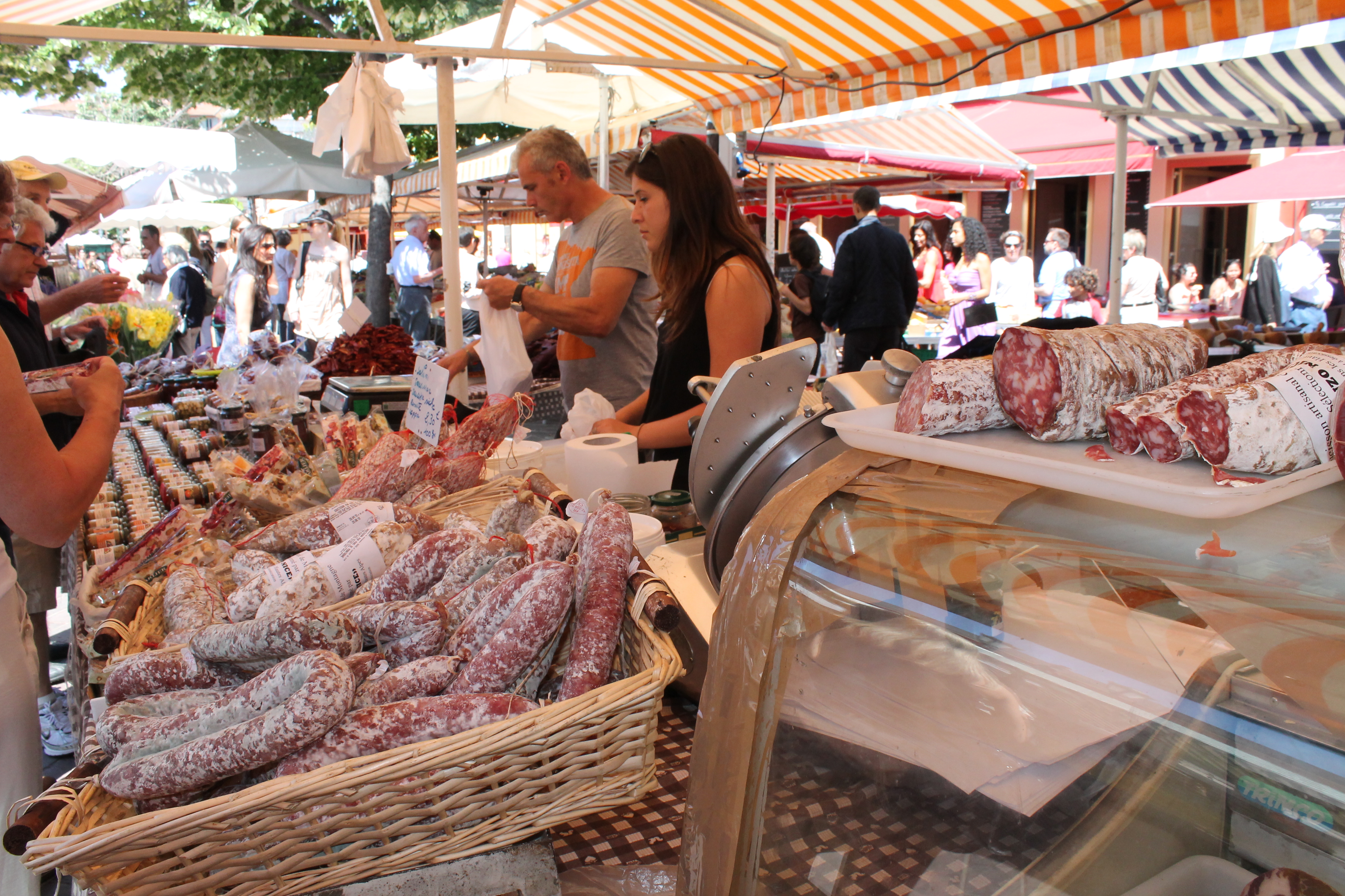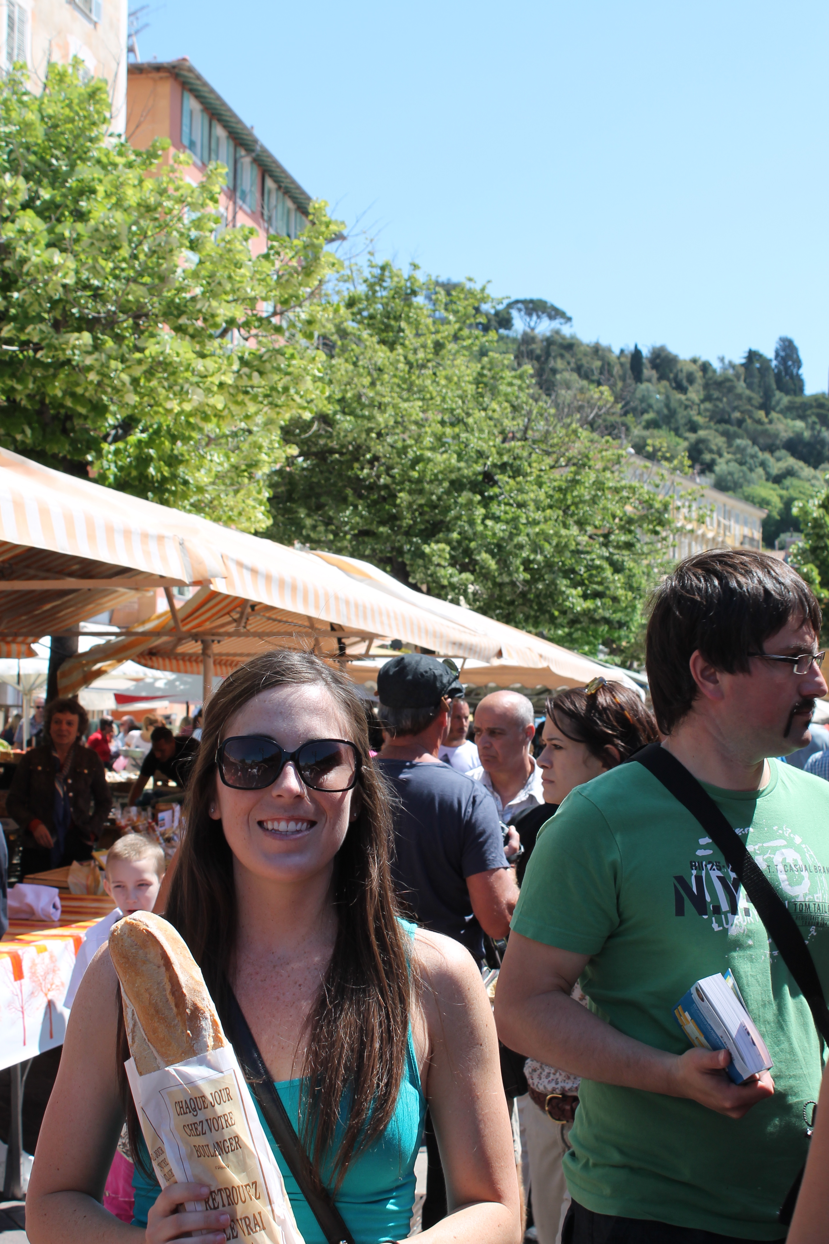 After checking into our hotel early (woohoo!) we headed down to the Cours Salaya Saturday market, walking through the clean, pastel streets of the city. The market was such a treat! There were flower and food and soap and craft vendors everywhere, with tons of free samples. All I had wanted since I had been in France was a baguette, and I finally got one! My mom enjoyed tasting the pesto! We spent about an hour wandering the market before heading about a block away to the beach!
