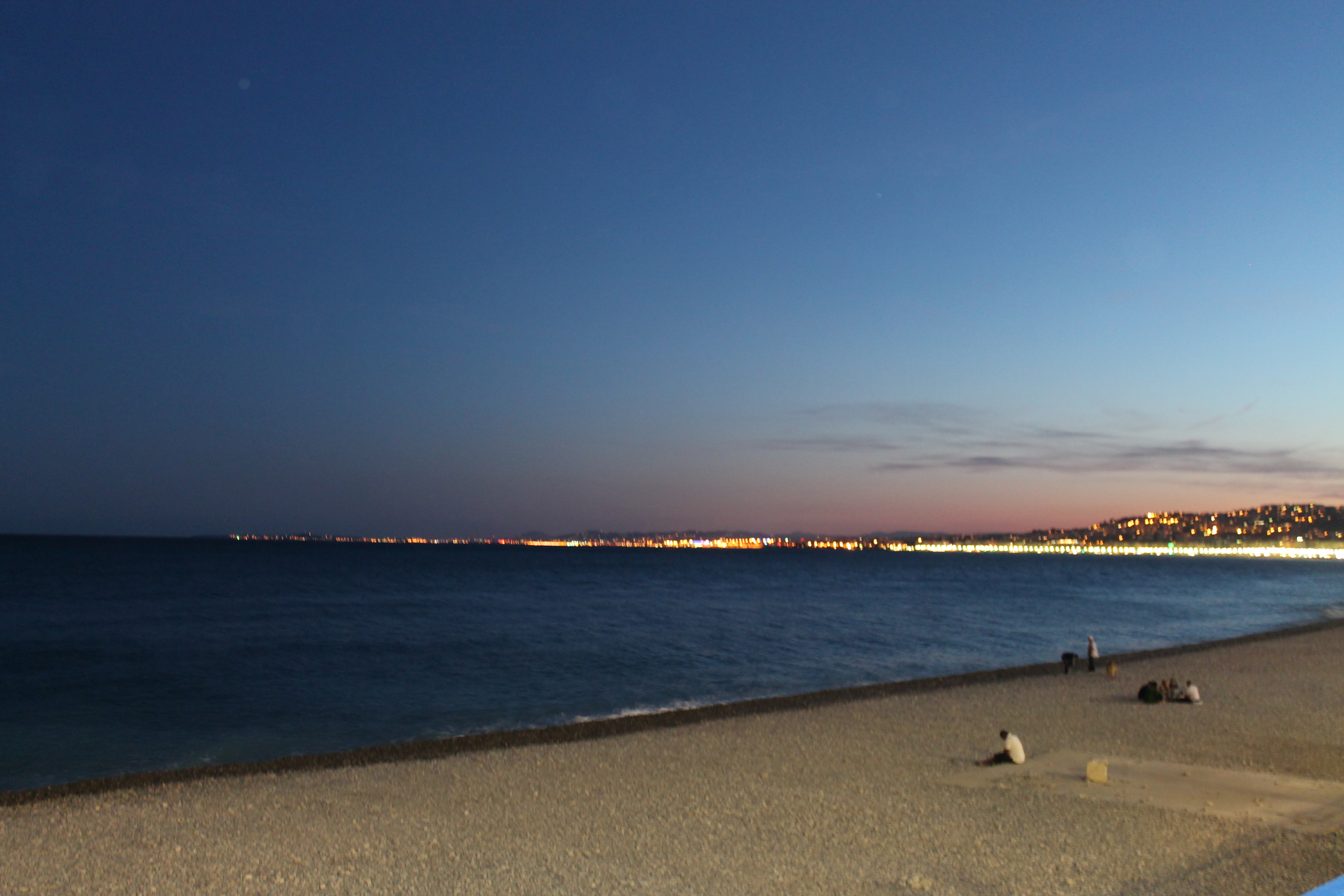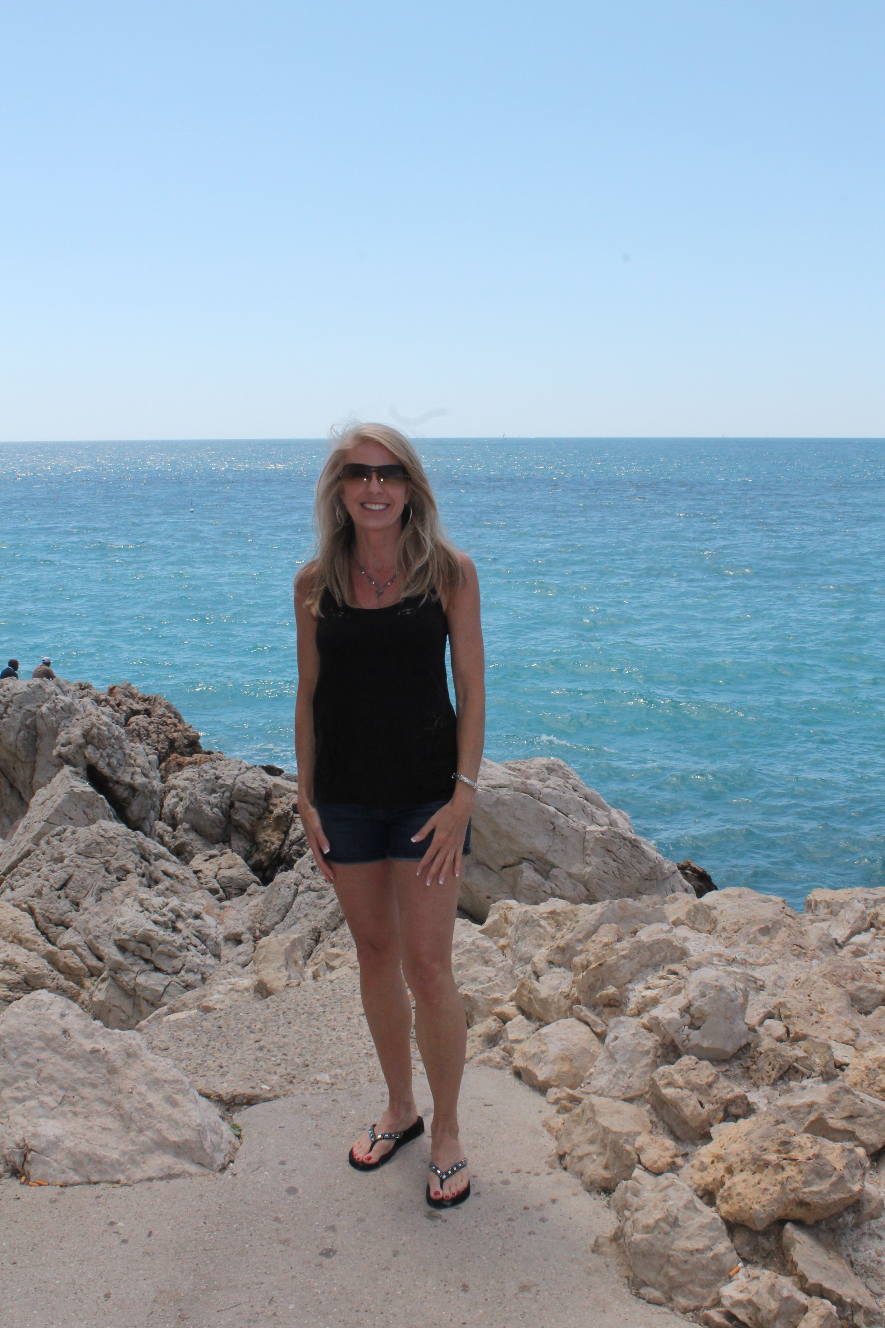 The beach was fantastic!! I know my mom has been to tons of islands and tropical locations with gorgeous beaches, but I had never before seen water as blue as the water in Nice! I loved how it went from light blue to dark blue, and how the black beach stones contrasted with the glimmering water. I wanted to go touch the water, but the way the rocks sort of just dropped down into the water made me nervous I would fall in, so I just took pictures from the edge 🙂