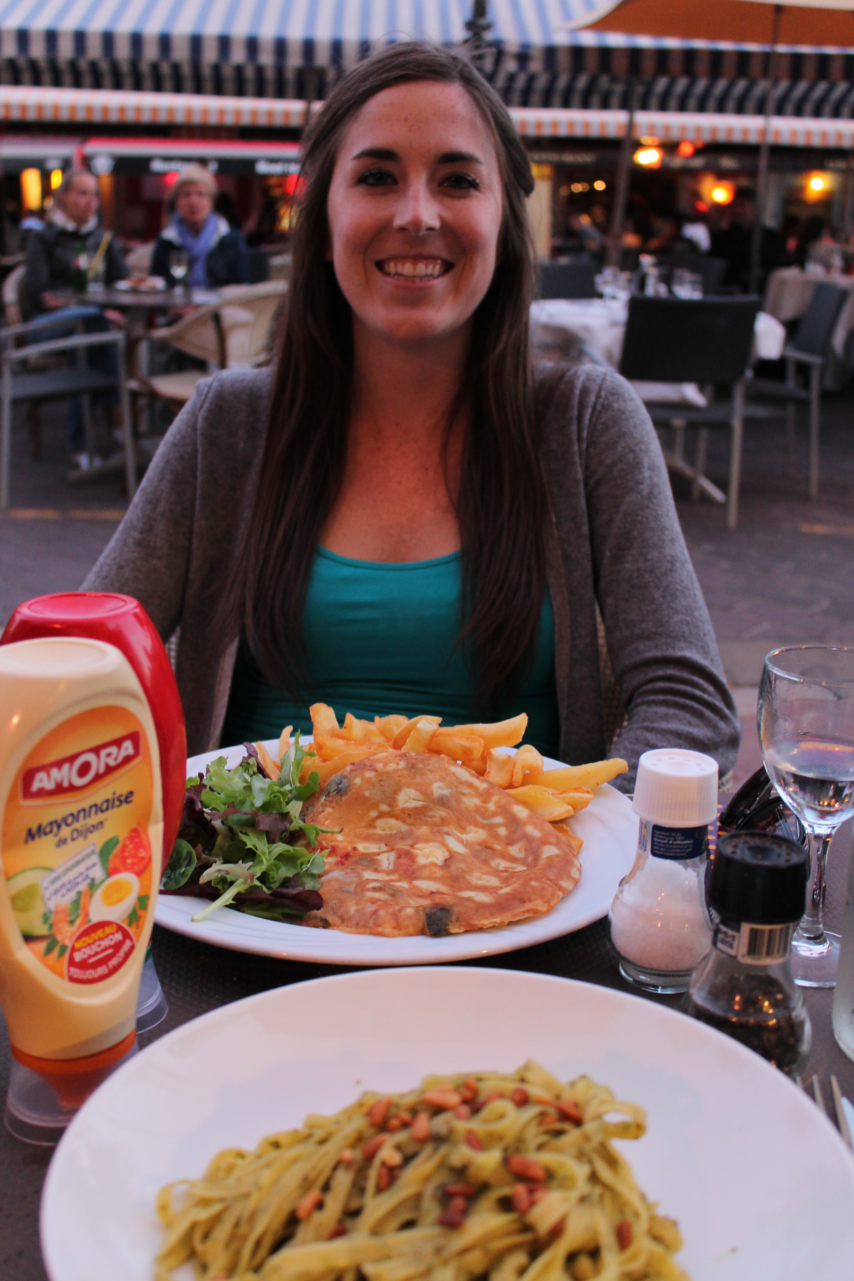 We finally found a nice cafe that looked like it offered relatively healthy food. (Only five days into the trip & we already felt so gross from the lack of fruit & salad in our diets!) We felt like all we were eating was bread, bread, and more bread. Unfortunately, this dinner turned out to be the same! Since we were so famished, we munched on the delicious bread they bought us, while we waited for our entrees. We also continued to discuss how they always bring bread to the table, but no plates. We had a good laugh as we struggled to pour teeny tiny drops of olive oil onto our bread, from an open-top bottle, ultimately just spilling oil all over the table cloth. Multiple times. We’re so classy 😉