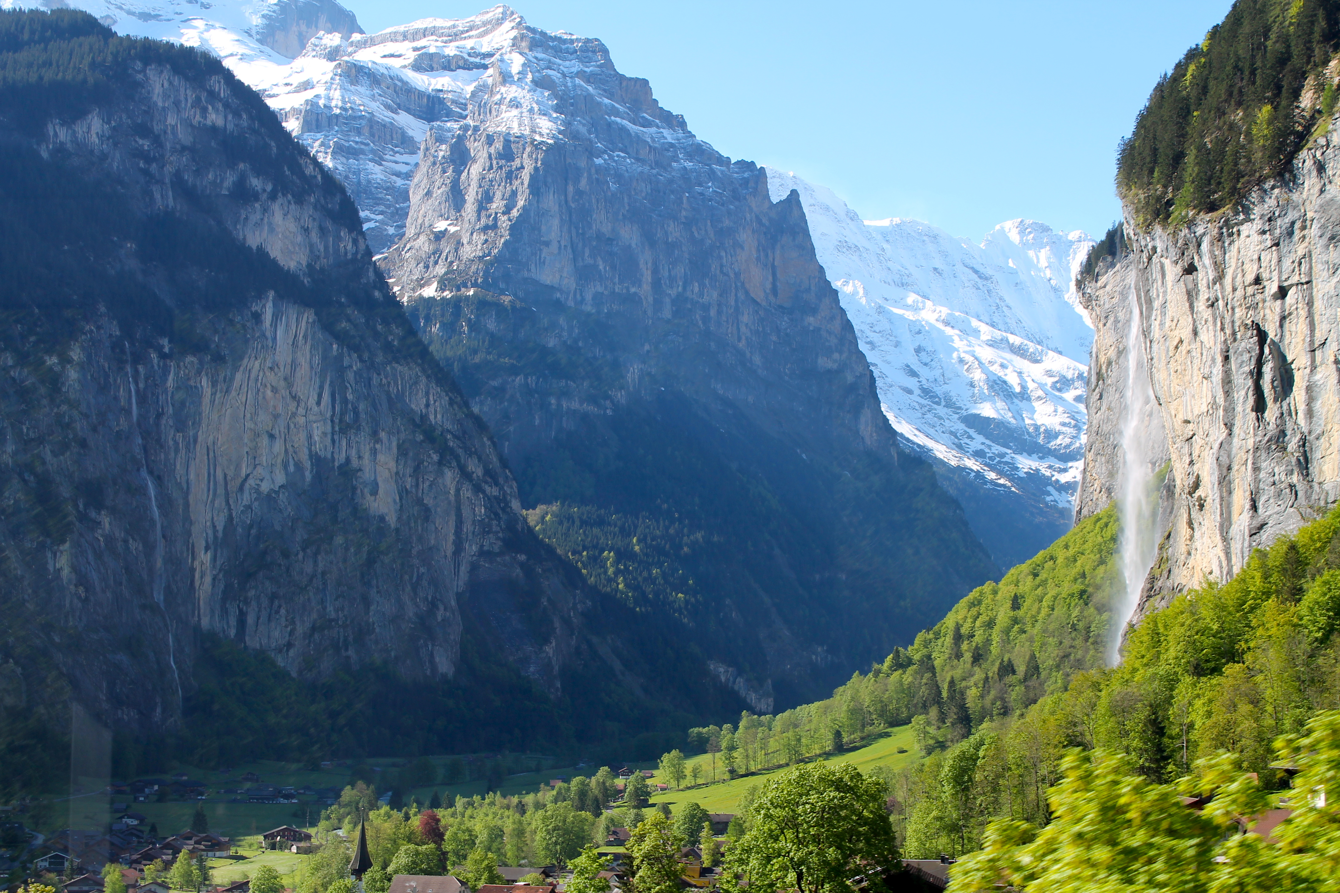 Our train didn’t depart for about an hour, so I shoveled down breakfast while rushing my mom along. Rather be early and sit around bored for an hour than enjoy breakfast and be late!! 😉 We took the same train to Lauterbrunnen as before, but this time instead of walking toward Staubbach Falls, headed to the cable car to Grutschalp. This first cable car wasn’t very scary; it was more fun! I don’t think I had ever been on one before, so I was mainly curious. My mom though wasn’t too happy about being squished up against the door as the cable car swayed, even though she had been on a cable car before (in Alaska I think?) and knew what to expect.
