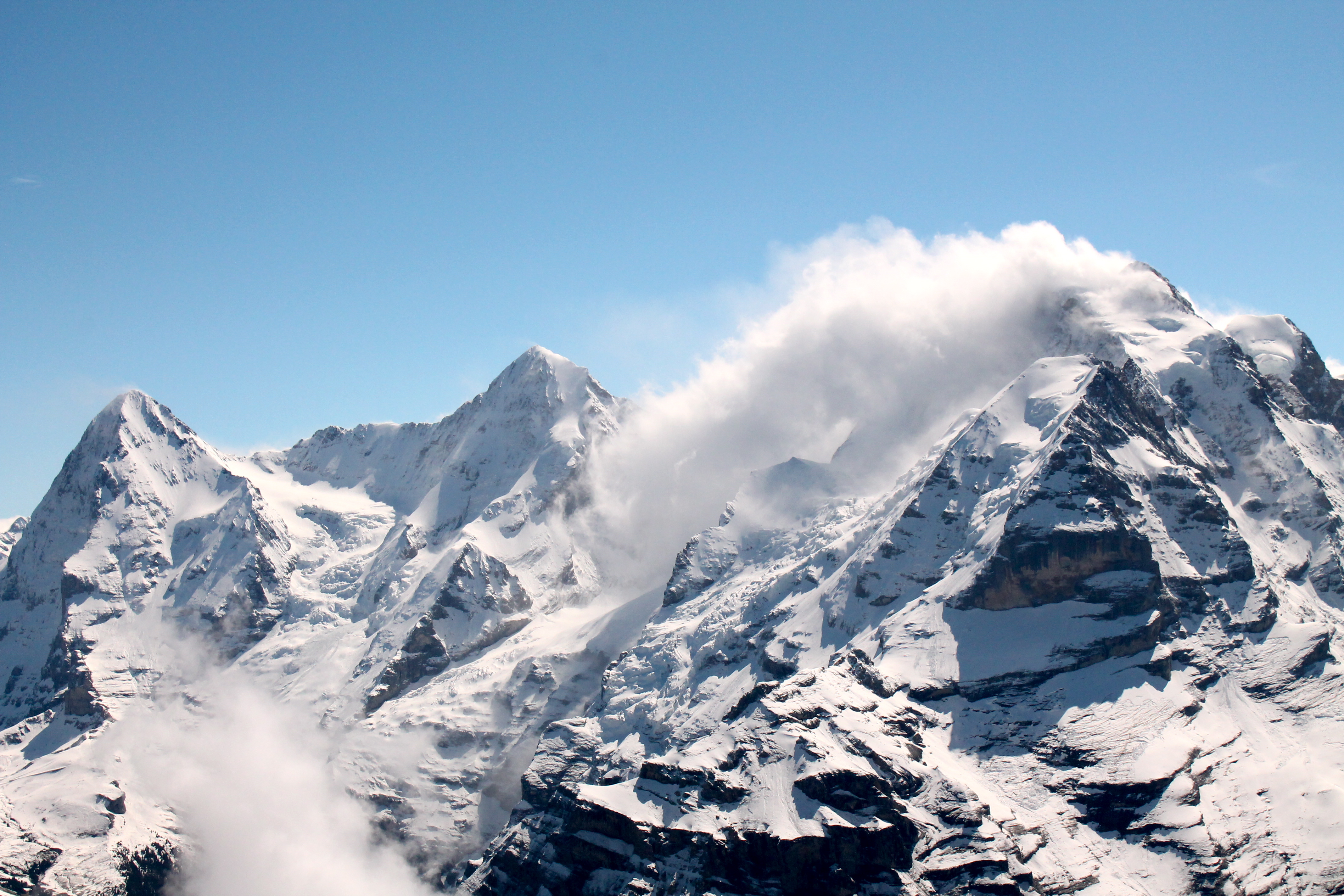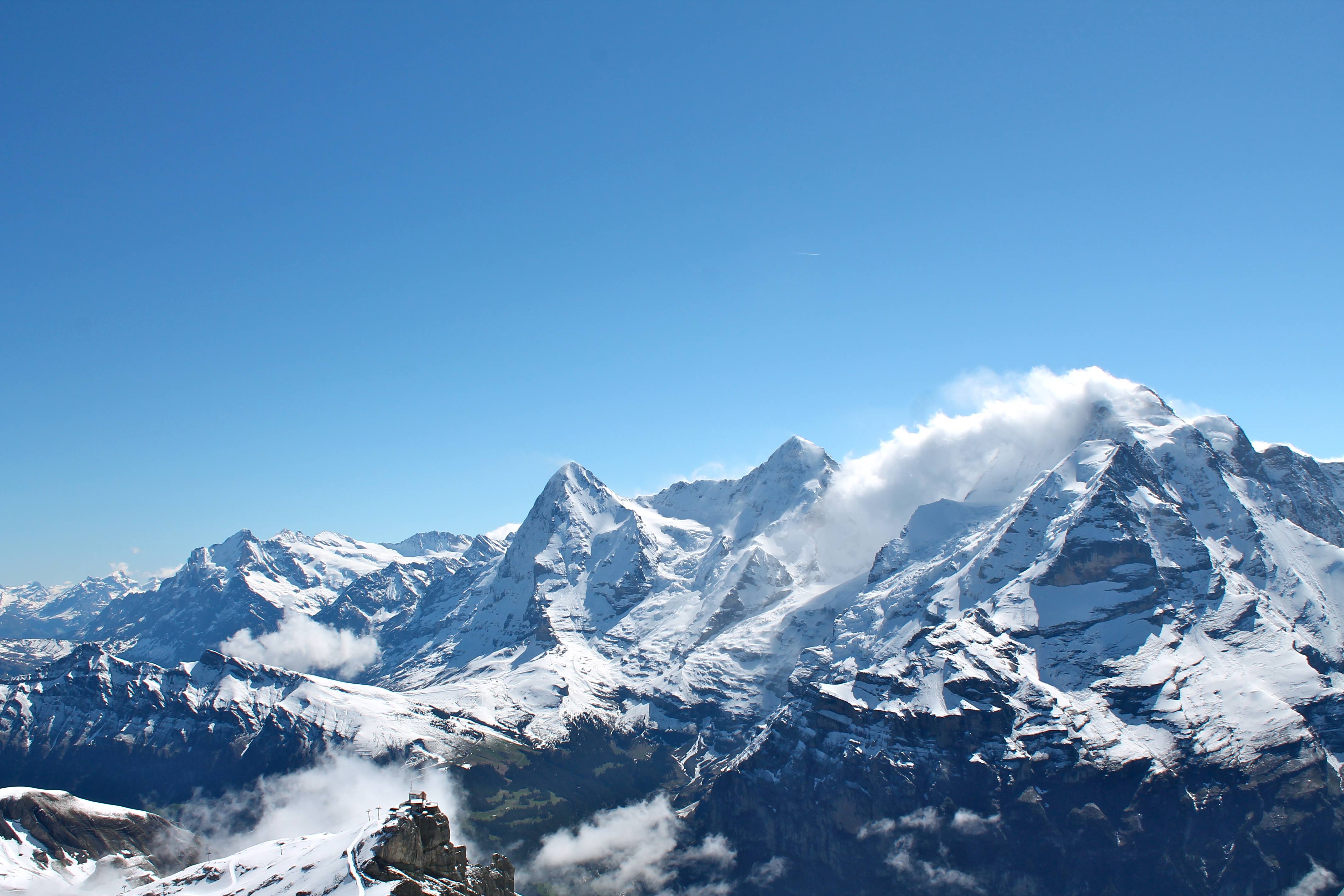 I ran downstairs to talk to Ursula about the plans. Jungfrau, the tallest peak, of course had the only cloud in Swizerland hanging over it. Schiltorn, a smaller peak that overlooks the three other largest peaks (Monch, Eiger, Jungfrau), was perfectly clear. We could head to Jungfrau and hope that the cloud blocking the lookout point moved by the time we got there (3 hours later) or head to the top of Schilthorn and enjoy the view from there.