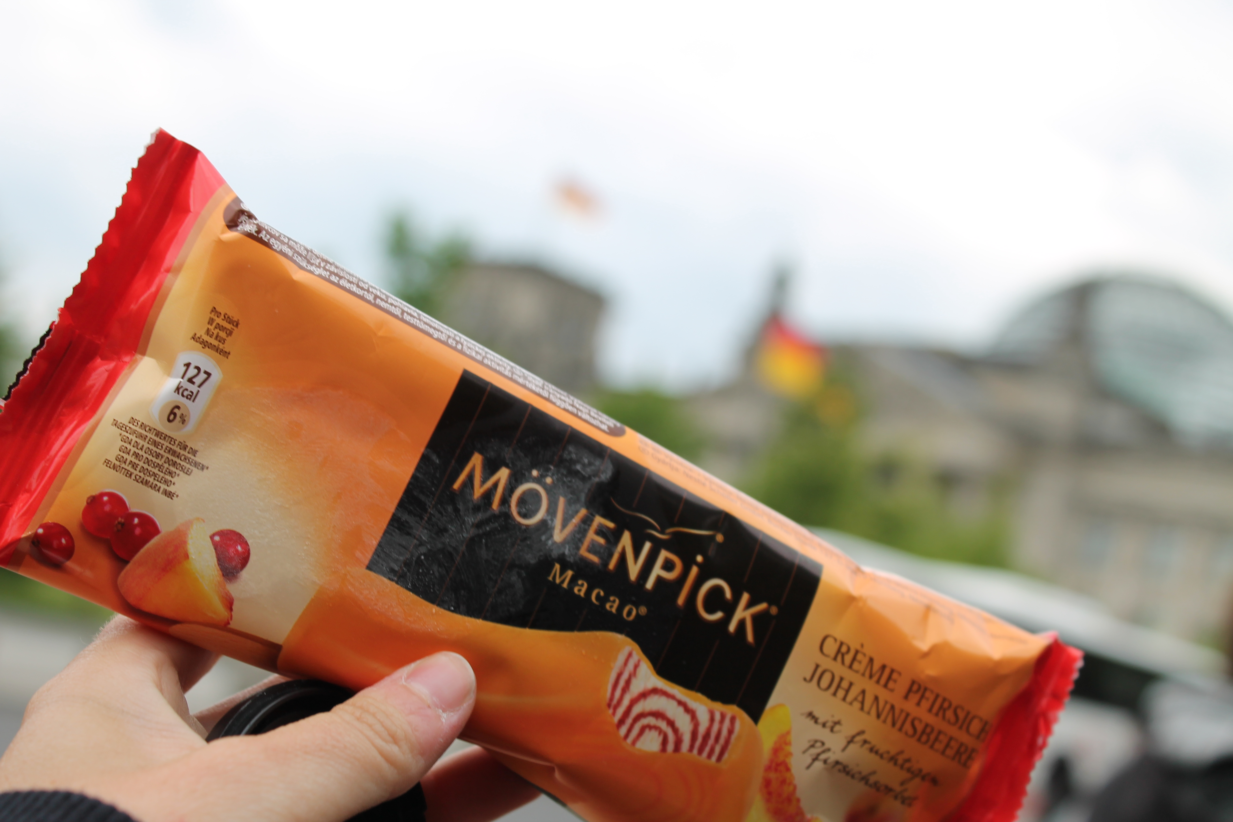Adding to the long line was the fact that the weather was slowly becoming worse and worse. It was now probably mid-50’s, with quite a breeze….and I was in flip flops. (I refused to be seen in Berlin, a fashion hub, wearing tennis shoes with jeans. No. Just no.) While my mom and I debated what to do, we took turns walking into a nearby gift shop to warm up. Because she is the Queen of Sweet Tooth’s, my mom of course came back from her turn with a surprise treat: MOVENPICK!!!!! (Remember? My favorite ice cream from Zurich!)