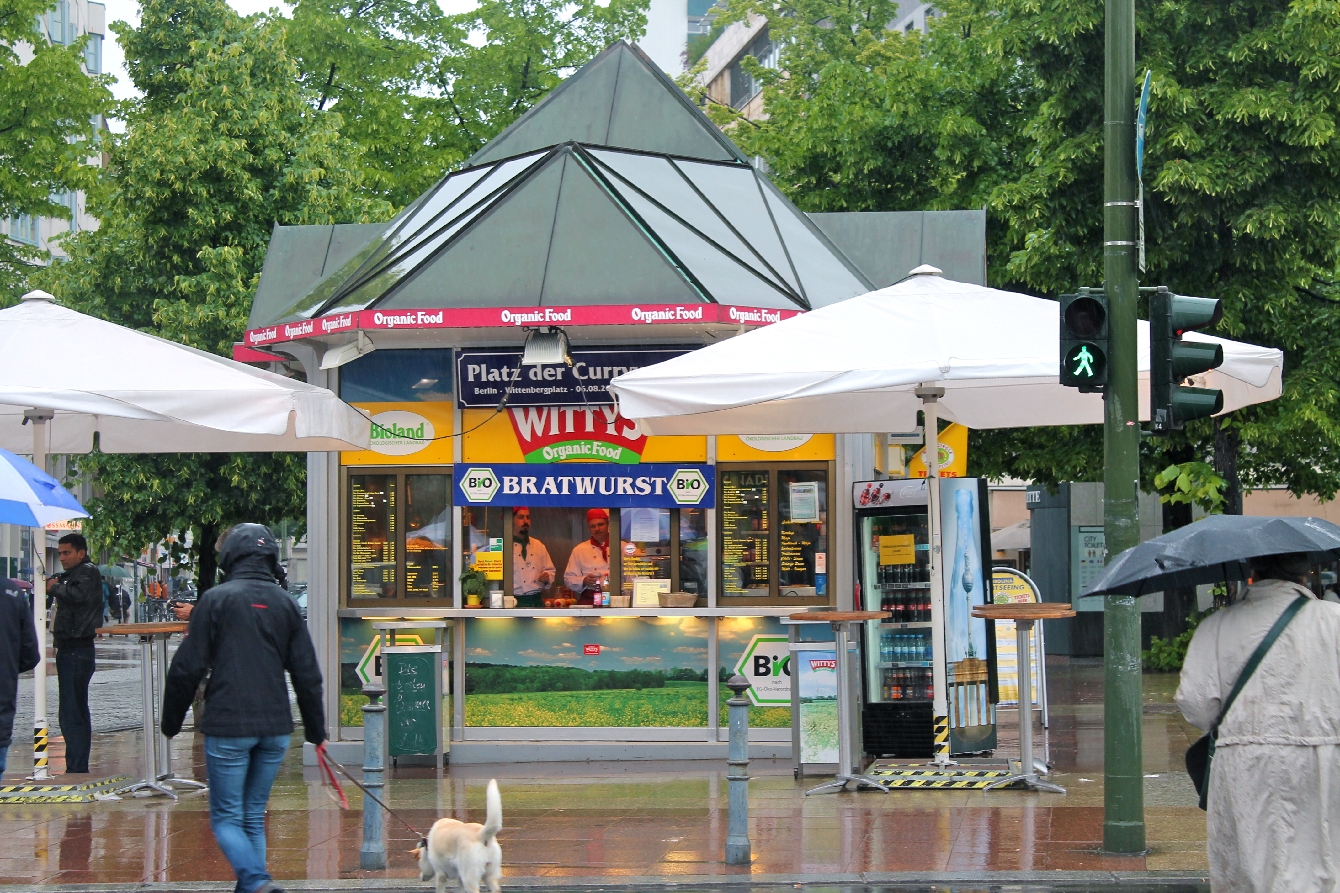 Finally stopping for lunch, we headed to Wittenbergplatz to find an all-natural bratwurst restaurant we had read about.  I figured that if I was still forced to eat sausages on the last day, I might as well try and have a healthier one, right?  We walked around in circles in Wittenbergplatz before giving up and heading back down to the metro.  Just as we started down the stairs though, we looked left and realized that the all-natural sausage “restaurant”….was actually a food cart!  So we got our brats and ate them in the forever falling rain!  It was delicious.  Success!
